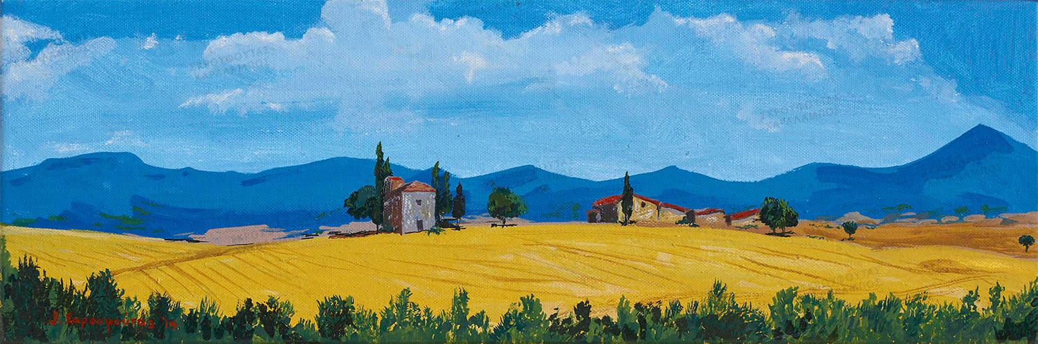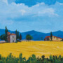 Λητό τοπίο, απλές γραμμές. Φόρμες από μικρά σπίτια, γραφικά, χτισμένα στα ολόχρυσα χωράφια της Τοσκάνης. Τόσο σύνηθες για την Τοσκάνη και τόσο μοναδικό σκηνικό για τον περαστικό.